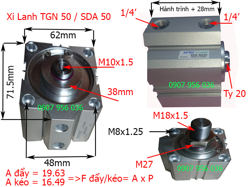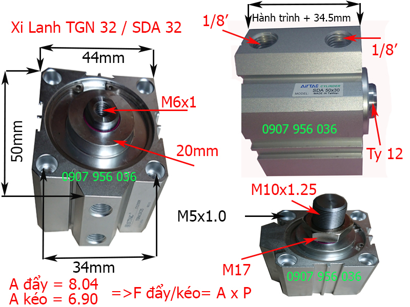 Ví dụ 2: xi lanh TGA 20 x50-S có đường kính ti là 8. Áp suất là 6 kg thì lực kéo = ?????